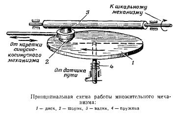 Множительный механизм предназначен для непрерывного умножения приращений пути ASна cos а и sin а. Он обычно выполняется в виде двух одинаковых фрикционов: один для определения Ах, второй – Ау Электрический сигнал, поступающий от датчика пути, с помощью сельсина-датчика счетно-решающего устройства преобразуется в механическое вращение диска / с числом оборотов, пропорциональным пути, проходимому машиной. Это вращение передается на валик 3 посредством промежуточного шарика 2, заключенного в обойму, который изменяет свое положение на диске под воздействием линейного перемещения одной из кареток синусно-косинусного механизма. Скорость вращения валика прямо пропорциональна произведению скорости вращения диска на расстояние шарика от центра диска. А это расстояние для одного фрикционного механизма пропорционально синусу дирекционного угла машины, а для другого – косинусу. Таким образом, угловая скорость вращения валика пропорциональна приращению соответствующей координаты.