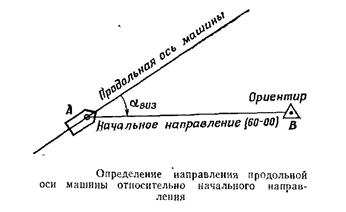 Выбирают на местности такую точку А, чтобы с нее хорошо был виден какой-либо удаленный ориентир В. Направление АВ принимают за начальное. Устанавливают машину на точке А, включают гирокурсоуказатель л определяют направление продольной оси машины относительно начального направления. Для этого с помощью визирного устройства машины измеряют угол авиз – На шкале «Курс» устанавливают отсчет, равный оси: