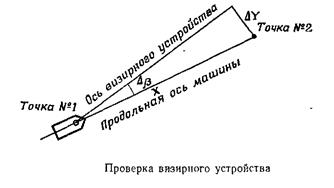 Полученное значение угла устанавливают на шкале «Курс» и с максимальной скоростью, чтобы исключить ошибки, обусловленные уходом гироскопа, проходят весь участок и над второй вехой снимают отсчеты со шкал х и у. Если угол рассогласования между осью визирного устройства и продольной осью машины отсутствует, то отсчет на шкале у останется равным нулю. В противном случае отсчет будет отличным от нуля.