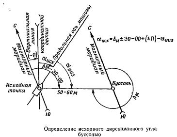 Определение исходного дирекционного угла. Исходным дирекционным углом называется угол в исходной точке между северным направлением вертикальной линии сетки карты и продольной осью машины. Если машина на исходной точке установлена так, что ее продольная ось совпадает с направлением на выбранный ориентир, то исходный дирекционный угол аисх будет равен дирекционному углу направления на ориентир, который предварительно измерен по карте. Однако точно и быстро совместить ось машины с направлением на ориентир трудно. Поэтому для определения исходного дирекционного угла поступают так.