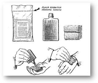Рис. 1. Индивидуальный противохимический пакет и пример пользования им