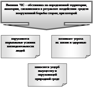 Нам представляется, что ЧС военного характера (военные столкновения) - это особая группа конфликтных и экологических ЧС, возникших на определенной территории, вызванных повседневной деятельностью войск и воздействием современных средств поражения (ядерное, обычное, геофизическое оружие и ОНФП) на ВС и другие войска с их объектами (инфраструктурой), объекты экономики и население, приводящих к человеческим жертвам, ущербу здоровья людей и окружающей природной среде, значительным материальным потерям и нарушению условий жизнедеятельности населения (рис.1).