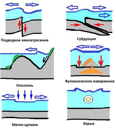 Механизм возникновения волн цунами вследствие каждой из рассмотренных причин схематично показан на рисунке.