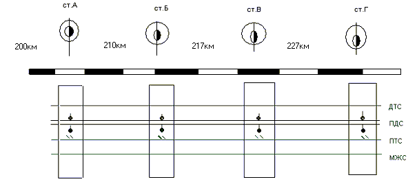 Схема связи ж/д. участка представлена ниже, где ДТС - дорожная телефонная связь (цветная цепь), ПДС – поездная диспетчерская связь (стальная цепь), ПТС – подстанционная телефонная связь (стальная цепь), МЖС – межстанционная связь (стальная цепь).