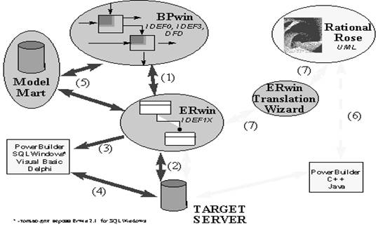 Rational Rose предназначен для генерации клиентской части приложения. Для генерации схемы БД объектную модель следует конвертировать в модель данных IDEF1X. Модуль ERwin Translation Wizard (Logic Works) позволяет перегружать объектную модель Rational Rose в модель данных ERwin (и обратно) и, с помощью ERwin, сгенерировать схему БД (7, рис.1). Таким образом, технологическая цепочка Rational Rose - ERwin Translation Wizard - ERwin позволяет реализовывать крупные проекты в технологии клиент - сервер.