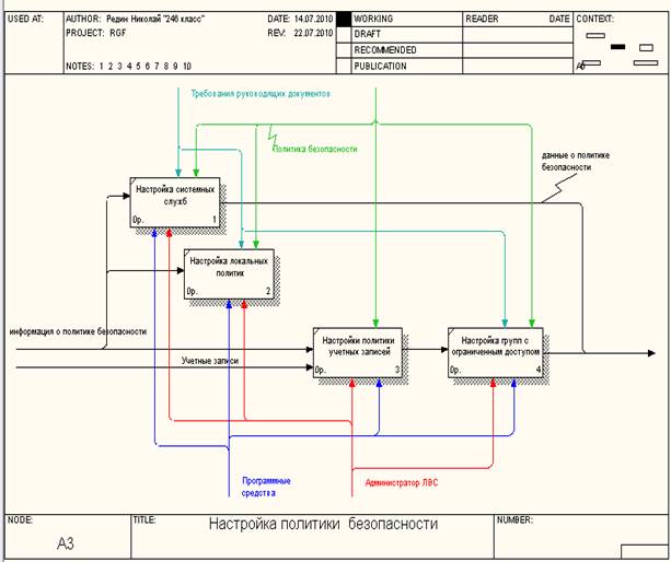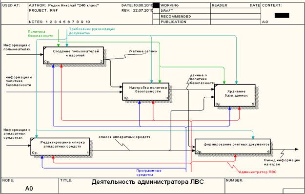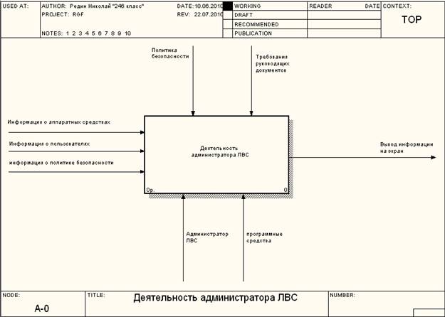 На рисунке 2 показано обеспечение деятельности администратора ЛВС. Для работы системы необходимо наличие данных для анализа, т.е. наличие входного потока данных(информация о аппаратных средствах; информация о пользователях; информация о политике безопасности). Выходным ресурсом системы являются результат запроса. В качестве механизма управления выступает администратор ЛВС, а механизмом исполнения являются программные средства, которые выводят на экран нужную информацию для администратора ЛВС.