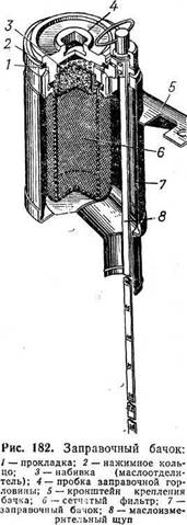 В заправочном бачке 7 (рис. 2) имеется два штуцера, один из них заправочный, закрыт пробкой 4, а в другой установлен маслоиз-мерительный щуп 8. Накидная гайка щупа навинчивается на резьбу штуцера бачка. В заправочной горловине установлен сетчатый фильтр б.