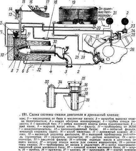 Масло после смазки трущихся деталей двигателя сливается в блок-картер, где собирается в маслоотстойнике. Из маслоотстойника масло забирается откачивающей секцией насоса и подается по трубопроводу 29 в радиатор 19, откуда по трубопроводу 20 стекает в бак 6.