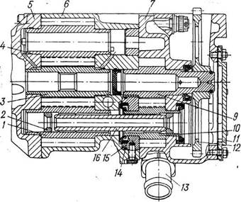 Масло из бака самотеком поступает в приемную полость нагнетающей секции через штуцер /3. Вращаясь, зубья шестерен 9 и 10 захватывают масло и перегоняют его в полость нагнетания, где создается давление, под действием которого открывается обратный клапан 8 и масло поступает в магистраль.