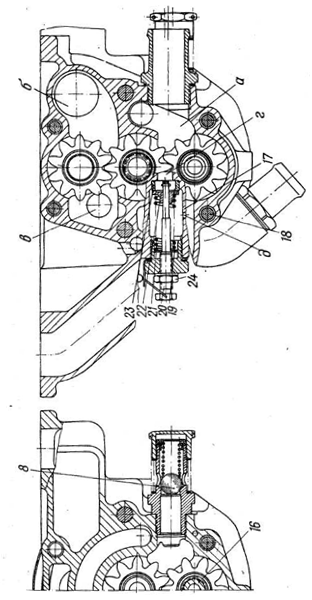 1 — ведущая шестерня откачивающей секции; 2 — кольцо; 3 и 4 — ведомые шестерни откачивающей секции; 5 — крышка-фланец; 6 — корпус откачивающей секции; 7 — корпус нагнетающей секции; 8 — обратный клапан; 9 — ведущая шестерня нагнетающей секции; 10 — ведомая шестерня нагнетающей секции; 11 - задняя крышка; 12 — шестерня привода масляного насоса; 13 — штуцер; 14 — самоподжимной сальник; 15 — заглушка; 16 — рес-сорка привода; /7 —корпус редукционного клапана; 18 — стяжной болт; 19 — шайба; 20 — винт; 21 — пружина; 22 — клапан; 23 — седло клапана; 24 — контргайка винта; а — отверстие для подвода масла из картера; б — отверстие для подвода масла из центробежного фильтра; в —канал выхода масла из откачивающих секций радиатора; г — осевой канал; д —радиальный канал