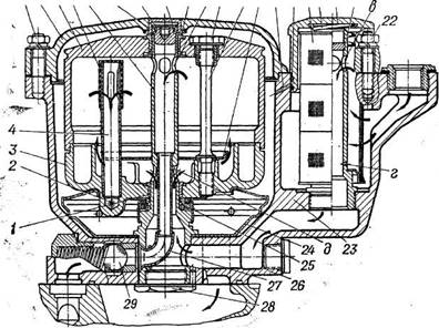 / — бронзовая втулка; 2 — форсунка; 3 — крышка ротора; 4 — маслозаборная трубка; 8, 14 и 22 — гайки; 6 — крышка фильтра; 7—«корпус ротора; 8 — сетка; 9 — стержень ротора; 10 — втулка; 11— пробка смотрового отверстия; 12 — стопорное кольцо; 13 — бронзовая втулка стержня ротора; 15 — шпилька; 16 — щиток; 17 — резиновое кольцо; 18 — сетчатый цилиндр; 19 — пружина; 20 — крышка фильтра грубой очистки; 21 — стержень; 23 — корпус; 24 — маслоотражательный щиток; 25 — опорный подшипник; 26 — штуцер; 27 — трубка отвода очищенного масла; 28 — заглушка; 29 — шарик обратного клапана; а — отверстие стержня ротора; б — канал; в — верхнее отверстие; г — нижнее отверстие; д — нижнее отверстие стержня