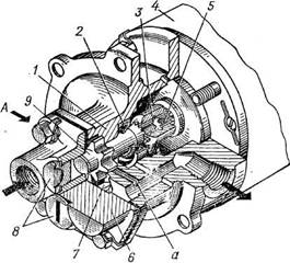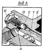 В насосе смонтирован шариковый перепускной клапан с пружиной 12, отрегулированной на давление 12±2 кгс/см2 . Масло из бака самотеком по каналам в корпусе насоса попадает в приемную полость, где захватывается зубьями шестерен 7 и 9 и подается в нагнетательную полость и из нее в магистраль двигателя. Если давление в магистрали становится выше допустимого, отжимается шарик 11 перепускного клапана и масло из нагнетательной полости перепускается через канал а обратно в приемную полость.