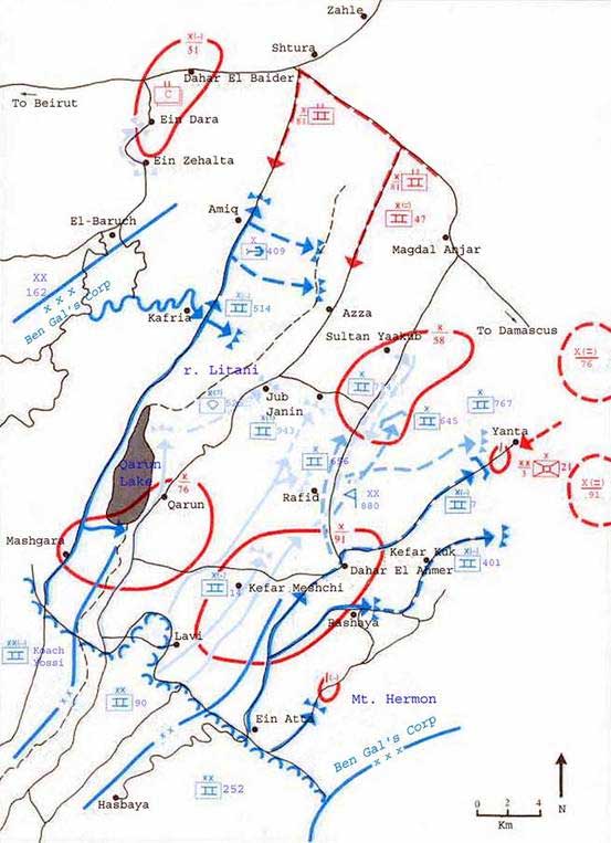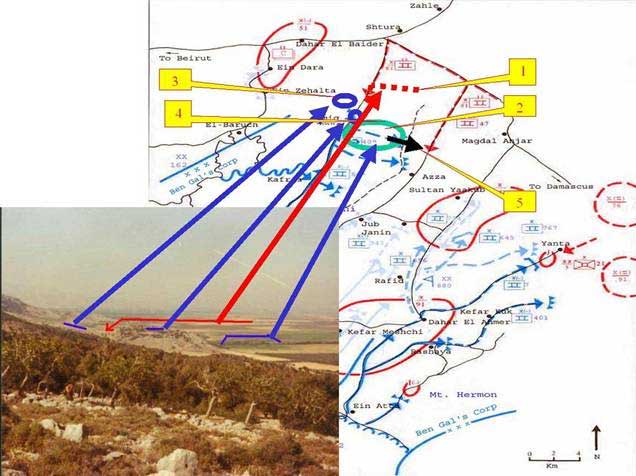 В связи с движением сирийской бронетанковой бригады в Бекаа, самолёты ВВС начали атаковать эту бригаду ночью. Она понесла тяжёлые потери. На этом этапе мы уже могли планировать, как создать давление на сирийцев в Бекаа, как со стороны хребта, так и со стороны Джабель Барук, со спусков ведущих с гор в Бекаа. И действительно, мы использовали эту дорогу. Наша часть двигалась по ней, наткнулась на танки Т-72 и уничтожила их за 2 часа до вступления в силу соглашения о прекращении огня в полдень в пятницу.