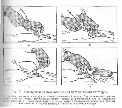 Ликвидация задержки мочи. В большинстве случаев при острой задержке мочи производят катетеризацию мочевого пузыря. При невозможности введения катетера (при повреждении мочеиспускательного канала) следует произвести надлобковую пункцию мочевого пузыря.