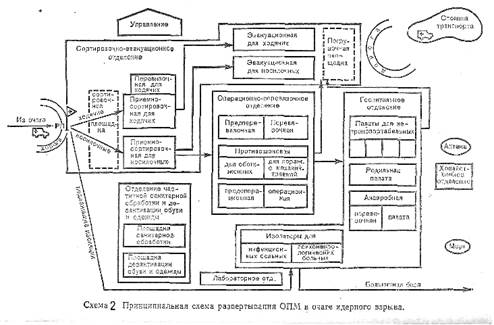 В связи с наличием большого числа временно нетранспортабельных, возникает необходимость существенного расширения госпитального отделения ОПМ и создания реанимационного отделения на базе операционно-перевязочного. В этом подразделении осуществляется полный объем токсико-терапевтической помощи, состоящей из специфических, неспецифических, симптоматических и патогенетических методов лечения, направленных на поддержание жизненно важных функций организма. Из этого отделения пораженных направляют в палаты госпитального отделения или на эвакуацию в больницы загородной зоны.