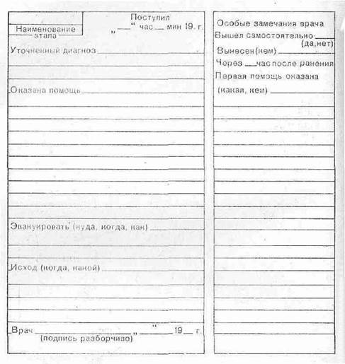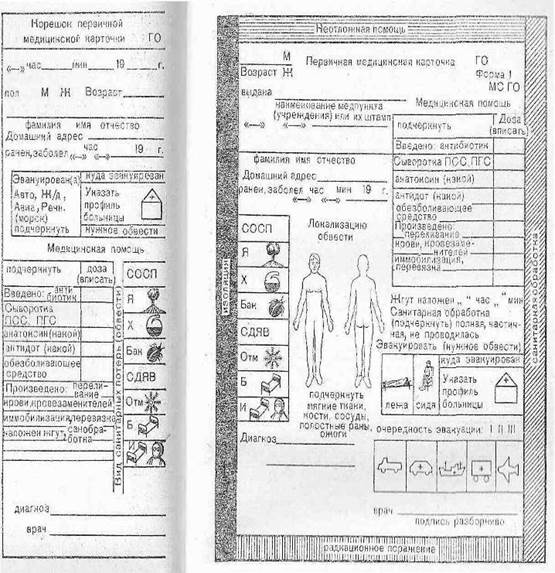 Пораженных и больных, поступающих в ОПМ, регистрируют, заполняют на них первичную медицинскую карточку (рис.10). Правильное и четкое заполнение карточки обеспечивает своевременность и преемственность проводимых лечебных мероприятий в отделениях ОПМ и на последующем этапе медицинской эвакуации. Первичная медицинская карточка ГО является медицинским и юридическим документом. В карточке записывают основные данные о диагнозе и характере поражения, оказанной помощи, способе эвакуации и др. Для обозначения срочной медицинской помощи и некоторых особенностей поражения на карточке имеются цветные сигнальные полосы (верхняя красная, нижняя синяя, правая желтая и левая черная), что дает возможность медицинскому персоналу быстро ориентироваться в характере поражения и оказанной медицинской помощи.