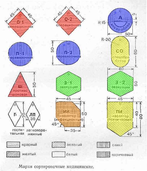 Медицинскую сортировку производит врач, который решает, нуждается ли пораженный в медицинской помощи в ОПМ, определяет ее очередность и в каком отделении ОПМ эта помощь должна быть оказана. Решение врача фиксируется сортировочными марками, обозначающими место и очередность дальнейшего направления пораженного (рис.11). При использовании автотранспорта на каждую машину, выходящую из ОПМ, выдается эвакуационный паспорт, в котором указываются маршрут движения, номер автомашины, количество пораженных того или иного профиля и общее их количество, время отправления из ОПМ.