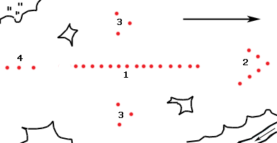 1- основна частина партизанського підрозділу; 2- головна стежа; 3 - бічні стежі; 4- замикаюча стежа.
