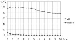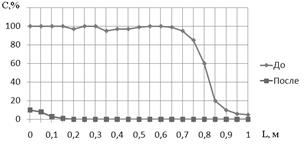Первоначально в коробе формируется локальное облако аэрозоля (размер частиц 1..5 мкм) протяженностью (L ) около 1 м и концентрацией (C ) 10 мл/м3 , равномерной вдоль всего облака (вентилятор отключен). После ультразвукового воздействия с расстояния 50 м в течение 10 сек. распределение концентрации аэрозоля приняло вид, показанный на рисунке 15 (в процентах от исходной концентрации). Таким образом, аэрозоль был полностью коагулирован (>99%).