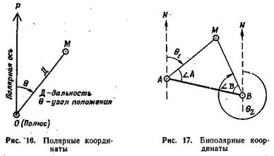 Система плоских полярных координат (рис. 16) состоит из точки О — начало координат, или полюса, и начального направления ОР, называемого полярной осью. Положение точки М на местности или на карте в этой системе определяется двумя координатами: углом положения 0, который измеряется по ходу часовой стрелки от полярной оси до направления на определяемую точку М (от 0 до 360°), и расстоянием