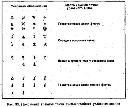 Фигурный рисунок такого знака включает эту как бы главную точку, показывающую точное положение данного объекта на местности, и обозначает, что это за предмет. Такая главная точка находится (рис. 33):
