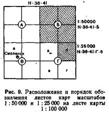 Листу карты масштаба 1:100000 соответствуют 4 листа масштаба 1:50 000, обозначаемые русскими прописными буквами А, Б, В, Г, а листу масштаба 1:50 000 — 4 листа карты 1:25000, которые обозначаются строчными буквами а, б, в, г (рис. 9). В соответствии с этим номенклатура листов карты 1:50000 слагается из номенклатуры листа масштаба 1:100000, а листов