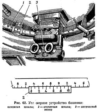 Измерение углов с помощью башенного угломера. На танках и некоторых других боевых машинах для измерения угла поворота башенки имеется угломерное устройство (рис. 62). Оно состоит из основной шкалы 1, расположенной на погоне по всей длине ее окружности, и отчетной шкалы 2, укрепленной на вращающемся колпаке башенки. Основная шкала разбита на 600 делений (цена деления 0-10). Отчетная, шкала имеет 10 делений и позволяет отсчитывать углы с точностью 0-01. В некоторых машинах башейка механически связана со стрелками азимутального указателя, на котором имеются шкалы грубого и точного отсчетов углов. Азимутальный указатель также позволяет отсчитывать угол с точностью до 0-01. Для наведения на наблюдаемый предмет используется оптический визир, в поле зрения, которого имеется перекрестие или угольник. Оптический визир установлен на вращающейся башенке таким образом, что в положении 0-00 его оптическая ось параллельна продольной оси машины.