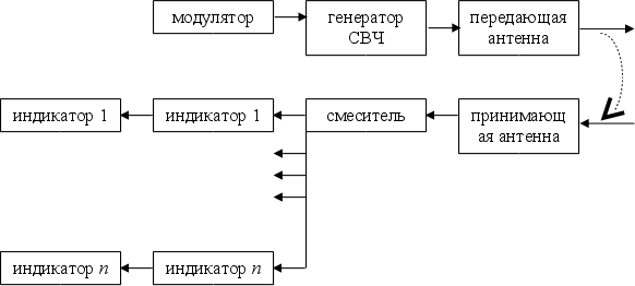 На приемник поступают прямой и отраженный сигналы, из которых на смесителе выделяется их разностная частота, значение которой после фильтровки передается на систему индикации.