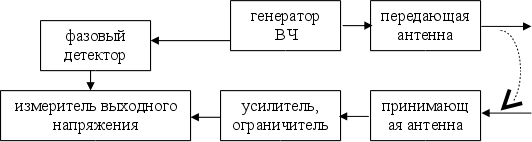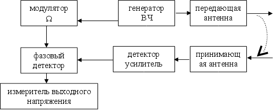 Принятый сигнал усиливается и его фаза вместе с фазой первоначального сигнала, детектируемой на фазовом детекторе, поступает на измеритель выходного напряжения.
