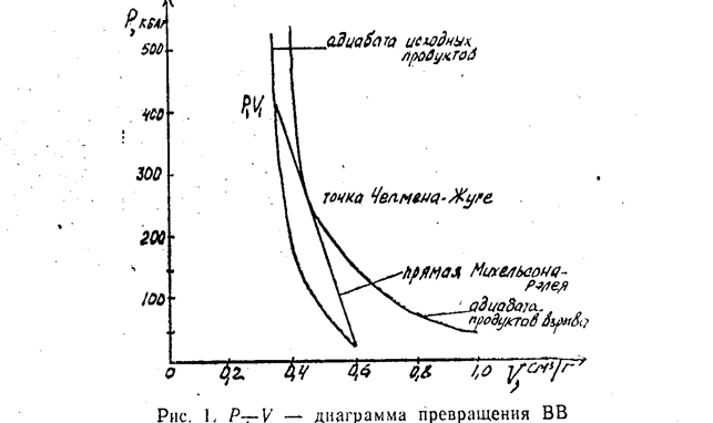 При стационарной детонации с такой же скоростью должны распространяться и другие промежуточные состояния, соответствующие выделению той или иной доля полной энергии. Следовательно; изменение состояний в процессе химической реакции должно происходить по прямой, соединяющей точки, так как только Р1 , V1 и Pо , Vо на этой прямой все промежуточные состояния распространяются по ВВ со скоростью D. Прямая равных скоростей распространения на Р—V диаграмме, по которой происходит .переход с одной адиабаты на другую — эта прямая Михельсона-Релея. Точка касания прямой Михельсона-Релея с адиабатой конечных продуктов взрыва —точка Чепмена-Жуге. Она отвечает моменту окончания химической реакции и выделению максимального количества тепла, идущего на поддержание процесса детонации.