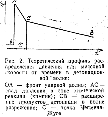 Теоретический профиль распределения давления или массовой скорости от времени в детонационной волне, приведен на рис. 2.