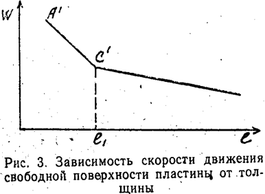 На рис. 3 приведена зависимость скорости движения свободной поверхности пластины от ее толщины. Область А'С' соответствует влиянию на скорость свободной поверхности ЗХР в детонационной волне. В точке С' химпик полностью затухает. Поэтому эта точка определяет параметры в плоскости Чепмена-Жуге падающей детонационной волны.