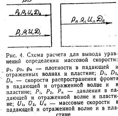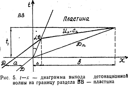 При падении детонационной волны на границу раздела ВВ — пластина по материалу последней пойдет затухающая волна, а по продуктам детонации — отраженная волна, направленная в другую сторону. На границе раздела имеют место следующие соотношения: