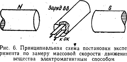 Идея откольного метода заключается в измерении . скорости движения свободной поверхности пластины, плотно прижатой к торцу заряда ВВ. Падающая детонационная волна распространяется по пластине с затухающими параметрами, при этом скорость движения свободной поверхности пластины связана с массовой скоростью волны, выходящей на эту поверхность следующим соотношением: