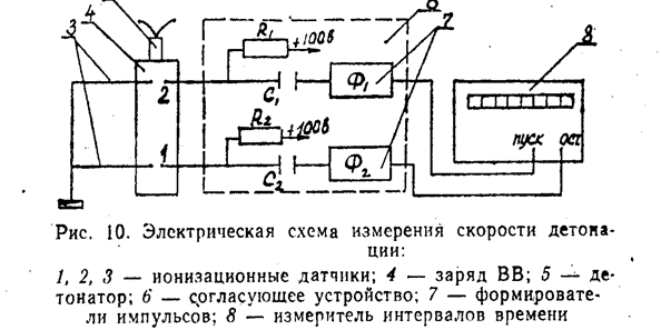 В детонационной волне продукты взрыва, находящиеся под большим давлением и высокой температурой, сильно ионизированы. Плотность электронов достигает 1017 —1020 на 1 см3 , что выше, чем проводимость полупроводников. В исходном же состояния ВВ, как правило, хорошие изоляторы. Резкое . изменение электрического сопротивления в момент прохождения детонационной волны используют для определения скорости детонация. Для этого в исследуемом заряде ВВ, на точно известном расстоянии друг от друга, располагают два или более ионизационных датчика, на которые подают определенное электрическое напряжение.. В момент прохождения детонационной волны сопротивление ионизационных датчиков резко изменяется, что вызывает скачки напряжения в согласующей электрической схеме (.формирователе импульсов), которые подаются .на регистратор промежутков времени. В качестве такого регистратора могут, использоваться хронометр, осциллограф или частотомер, С их помощью измеряется промежуток времени между моментами замыкания датчиков. Данный метод является основным методом определения скорости детонации и регламентирован ГОСТ.