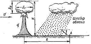 Объем воздушного пространства, в котором происходит осаждение радиоактивных частиц из облака взрыва и верхней части пылевого столба, принято называть шлей фом облака (см. рис. 2). По мере приближения шлейфа к объекту уровни радиации возрастают вследствие