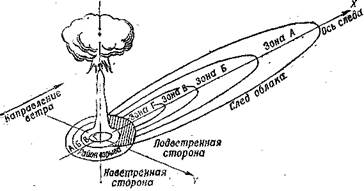 На местности, подвергшейся радиоактивному заражению при ядерном взрыве, образуются два участка: район взрыва и след облака (рис. 3). В свою очередь в районе взрыва различают наветренную и подветренную стороны.
