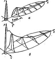 | Рис. 4. Схема распределения уровней радиации на время образования радиоактивного заражения в сечениях: а — по следу низкого воздушного ядерного взрыва, б — по следу наземного ядерного взрыва |