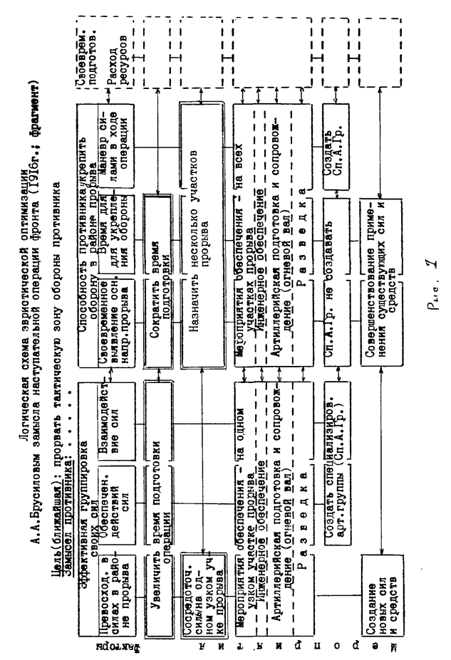 Далее генерал А.А. Брусилов комплексно оптимизировал всю систему диалектических противоположностей, учитывая значимость главных обеспечивающих мероприятий. В качестве инструментов оптимизации он использовал результаты анализа накопленного опыта и логические построения (А.А. Брусилов был блестящий аналитик). В результате им был разработан замысел на операцию (его основная идея и некоторые элементы были изложены выше). Вывод: генерал А.А. Брусилов мыслил» выполнял творческую работу, используя диалектический метод познания. Это позволило ему увидеть систему альтернативных мероприятий и, значит, систему направлений оптимизации, способствовало исключению шаблона в творчестве и, как итог, содействовало разработке эффективного замысла, успеху операции и снижению потерь.