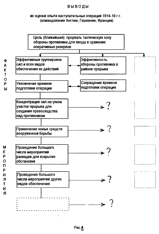Для сравнения на рис.2 показаны результаты анализа накопленного опыта генералитетами Англии, Германии, Франции. Эти результаты использовались ими при подготовке и проведении наступательных операции. Как можно видеть, не были выявлены основные альтернативы, свойственные наступательным операциям, то - есть генералитет указанных стран не умел выявлять системы диалектических противоположностей и противоречий. Это и есть неумение мыслить диалектически с его последствиями - неспособностью к оптимизации, шаблонность в творчестве и действиях. Итог - обязательный срыв выполнения поставленной задачи, кровавые потери.