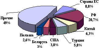Объем внешней торговли Украины товарами за 2003 год уменьшился по сравнению с 2002 годом на 14,2% и составил $23.428 млн. При этом экспорт уменьшился на 8,4% - до $11.582 млн., импорт сократился на 19,3% - до $11.846 млн. Отрицательное сальдо составило $264 млн. (в 2002 году - $2.038,2 млн.). Коэффициент покрытия импорта экспортом возрос с 0,86 в 2002 году до 0,98 в 2003 году. Внешнеторговые операции проводились с партнерами из 185 стран мира. Наибольшие объемы экспортных поставок осуществлялись в Российскую Федерацию - 20,7% от общего объема экспорта, в Китай - 6,3%, Турцию - 5,8%, страны ЕС - 8,8%, США - 3,8%, Беларусь - 3%, Польшу - 2,6% (рис. 1).