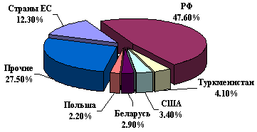 Наибольшие импортные поступления были из Российской Федерации - 47,6%. Из Туркменистана - 4,1%, США - 3,4%, Беларуси - 2,9%, Польши - 2,2%, страны ЕС - 12,3% (рис. 2).
