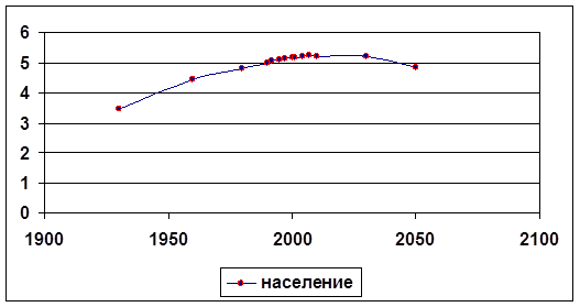 Данные рис. 2 позволяют сделать вывод о том, что численность Финляндии в период с 1930 г. по 2007 г. в целом возрастала. Темпы прироста населения с 1930 по 1960 гг. составила 0,9% в год, а позже с 1960 по 1990 гг. это показатель уменьшился и был равен 0,4%.