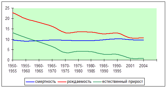 Показатели естественного прироста так же резко понижаются в связи с резким понижением рождаемости. И, если в 1950–1955 гг. показатель естественного прироста был равен 13,1%, то к 2004 году этот показатель снизился до отметки 0,9%.