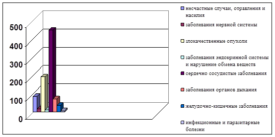 Из рисунка 4 мы видим, что наибольшее количество смертей происходит из-за сердечно сосудистых заболеваний. Низшие строчки занимают показатели инфекционных болезней; заболеваний эндокринной системы и нарушений обмена веществ (7 и 12 соответственно).