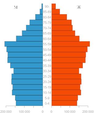 Снижение рождаемости проявляется в постепенном уменьшении младших возрастных групп. По сравнению с предыдущими поколениями на современном этапе выделяется относительно большая доля пожилых людей и группы лиц трудоспособного возраста. В 2000 г. происходит дальнейшее старение населения и абсолютное сокращение рабочей силы; крупные возрастные группы трудоспособного населения достигнули пенсионного возраста.