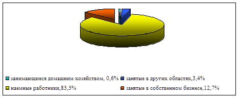 Из рисунка 9 можно видеть, что в структуре экономически активного населения Финляндии преобладают наемные работники (83,3%), так как очень много приезжих рабочих проживает в Финляндии. Вторую строчку занимают занятые в собственном бизнесе и составляют 12,7%. Третья строчка принадлежит населению, занятому в других областях (3,4%). Наименьший показатель характерен для населения, занимающегося домашним хозяйством (0,6%).