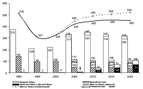 При умеренном варианте социально-экономического развития страны добыча нефти прогнозируется существенно ниже – до 450 млн. т в 2020 году. При критическом варианте рост добычи нефти может продолжаться лишь в ближайшие 1 - 2 года, а затем ожидается падение добычи до 360 млн. т к 2010 году и до 315 млн. т к 2020 году. Однако при любой динамике добычи нефти стратегическими задачами развития отрасли остаются обеспечение необходимой структуры запасов (в том числе территориальной), плавное и постепенное наращивание добычи со стабилизацией её уровня на долгосрочную перспективу. Добыча нефти будет осуществляться и развиваться как в традиционных нефтедобывающих районах – таких, как Западная Сибирь, Поволжье, Северный Кавказ, так и в новых нефтегазовых провинциях: на Европейском Севере (Тимано-Печорский район), в Восточной Сибири и на Дальнем Востоке, на юге России (Северо-Каспийская провинция). Главной нефтяной базой страны на весь рассматриваемый период останется Западно-Сибирская нефтегазоносная провинция. Добыча нефти в регионе будет расти до 2010 - 2015 годов при всех вариантах, кроме критического, а затем несколько снизится и составит в 2020 году 290 - 315 млн. т. В рамках критического варианта разработка месторождений с трудноизвлекаемыми запасами станет малорентабельной, что приведет к значительному падению добычи в регионе. В Волго-Уральской провинции и на Северном Кавказе добыча нефти будет падать, что обусловлено исчерпанием сырьевой базы. В умеренном и критическом вариантах снижение добычи в этом регионе будет более интенсивным. В целом в Европейской части России добыча нефти (включая шельфы) может составить 90 - 100 млн. т к 2020 году (против 110 млн. т в 2002 году). При благоприятном и умеренном вариантах развития экономики будут сформированы новые центры нефтяной промышленности в Восточной Сибири и Республике Саха (Якутия), на шельфе острова Сахалин, в Баренцевом море, российском секторе Каспийского моря, увеличится добыча нефти в Тимано-Печорской провинции. При интенсивном проведении геологоразведочных работ сырьевая база позволит, а программы социально-экономического развития Восточной Сибири и Дальнего Востока и стратегические интересы России в Азиатско-Тихоокеанском регионе делают желательным доведение добычи нефти в Восточной Сибири и Республике Саха (Якутия) к 2020 году до 80 млн. т (при умеренном варианте – 50 млн. т). В рамках критического варианта добыча нефти в Восточной Сибири и Республике Саха (Якутия) не превысит 3 млн. т. На шельфе острова Сахалин добыча нефти к 2010 году достигнет 25 - 26 млн. т и до 2020 года будет находиться на этом уровне, при критическом варианте она составит 16 млн. т. Обеспечение намечаемых уровней добычи и повышение эффективности нефтедобычи будут основываться на научно-техническом прогрессе в отрасли, совершенствовании методов бурения, воздействия на пласт, увеличении глубины извлечения запасов и внедрении других прогрессивных технологий добычи нефти, которые позволят сделать экономически оправданным использование трудноизвлекаемых запасов нефти. Исходя из современного и прогнозируемого качества сырьевой базы отрасли необходимы: