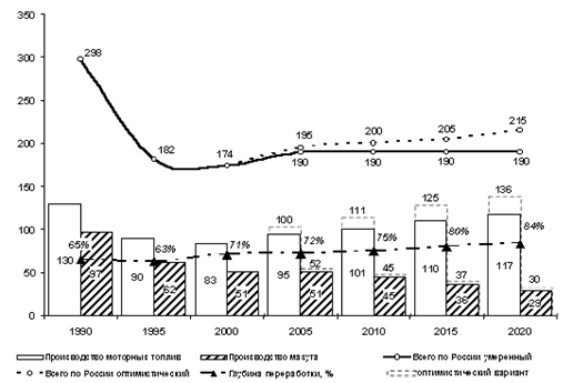 Нефтеперерабатывающая промышленность Для обеспечения перспективного внутреннего спроса на нефтепродукты и их экспорта предусматривается развитие нефтеперерабатывающей отрасли, и прежде всего на основе повышения эффективности использования нефтяного сырья. Приоритетом станет повышение качества моторных топлив в соответствии с изменением транспортного парка при сохранении технологически оправданного использования мазута в качестве резервного топлива на теплоэлектростанциях, безусловное удовлетворение нужд обороны страны. При всех вариантах развития, кроме критического, ожидается рост объёмов переработки нефти (рис.4). К 2010 году он может достигнуть 190 - 200 млн. т/год и к 2020 году – 190 - 215 млн. т/год с одновременным увеличением глубины переработки до 75% в 2010 году и до 80-85% к 2020 году. Объём производства моторных топлив (автомобильного бензина, дизельного топлива, авиакеросина) может увеличиться до 100 - 110 млн. т в 2010 году и до 115 - 135 млн. т в 2020 году. Выход светлых нефтепродуктов увеличится с 54% в 2002 году до 66-68% в 2020 году. При критическом варианте развития объём переработки нефти будет снижаться и может составить в 2020 году немногим более 170 млн. т.