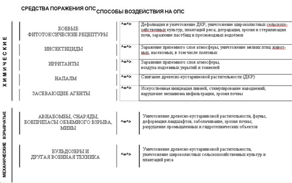 Таблица 1. Средства поражения, использованные в операции "RanchHand", и способы их воздействия на окружающую природную среду (ОПС)